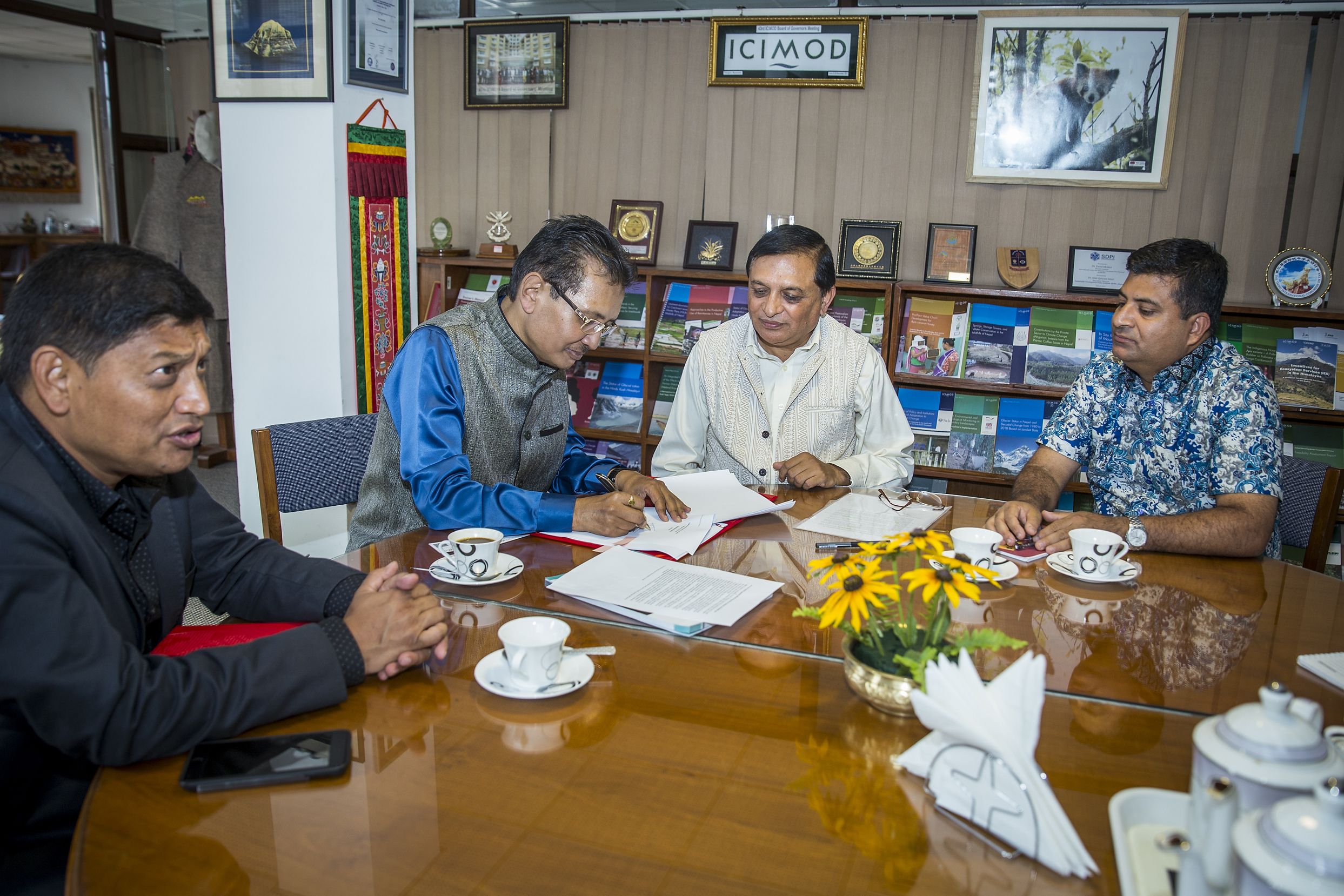 Exchanging MoU for Charter, standing of Himalayan Universities Consortium with Sikkim University and ICIMOD at ICIMOD Office, Kathmandu on 30 April 2018. From right side- Mr. Basanta Shrestha, Director Strategic Cooperation, Professor Jyoti Prakash Tamang, Dr. Eklabya Sharma, Deputy Director General, Dr. Chi H. Truong, Programme Coordinator of HUC and , Mr. Shekhar Ghimire, Director Administration and Finance.